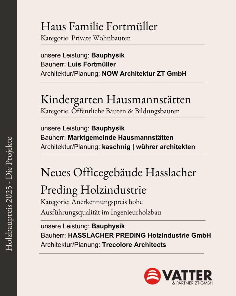 VATTER & Partner ZT-GmbH (Teil der DELTA Gruppe) mit den Leistungen Bauphysik und Statik freut sich über das starke gemeinsame Ergebnis beim Holzbaupreis Steiermark und bedankt sich bei Bauherrschaften und Projektpartnern für das Vertrauen und die hervorragende Zusammenarbeit.